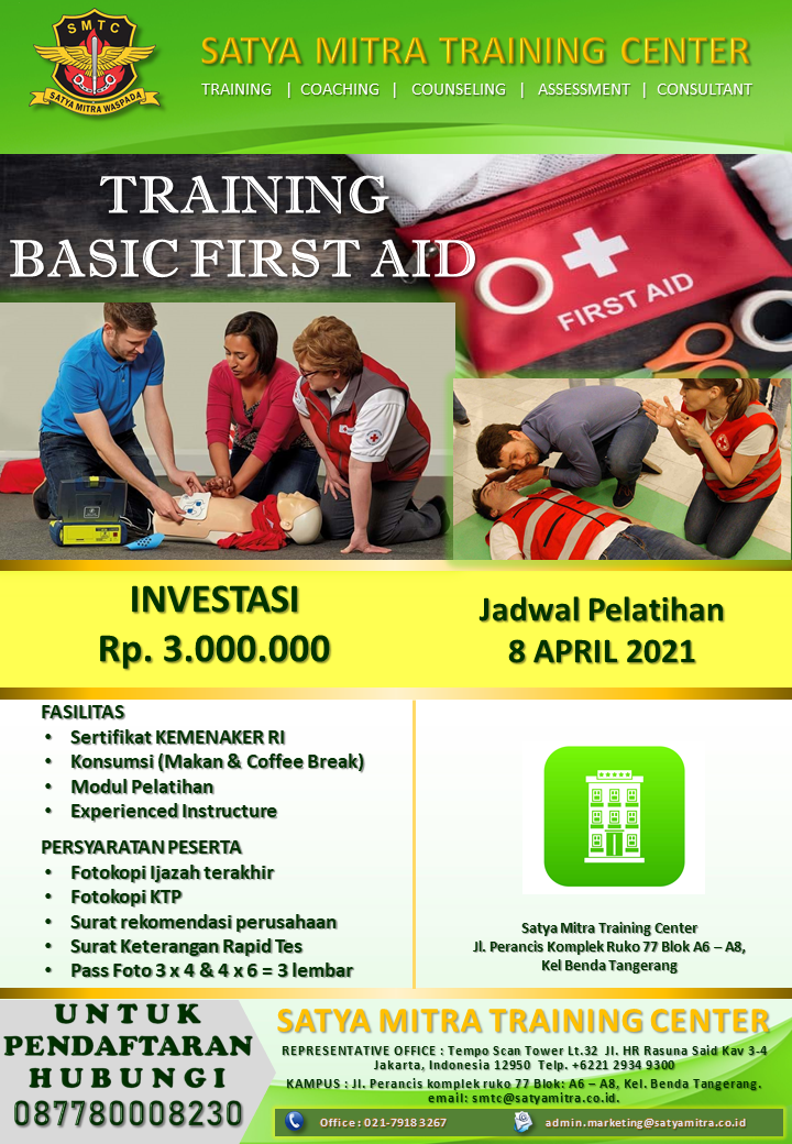 Satya Mitra Training Center menyelenggarakan Training Safety Basic First Aid untuk umum dan mahasiswa, informasi pendaftaran hubungi :
