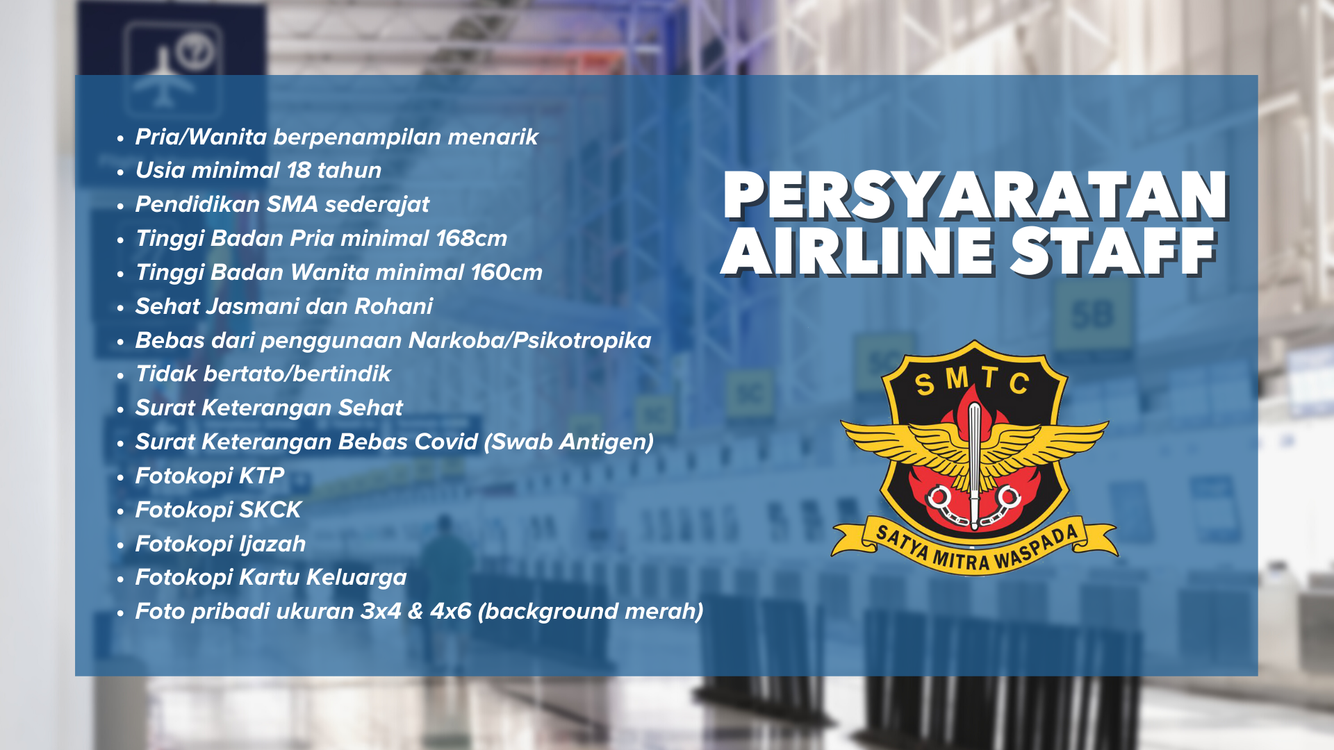 MENGAPA HARUS MEMILIH SMTC? SMTC memiliki keunggulan dalam mencetak sumberdaya manusia yang berkualitas, siap bersaing di dunia kerja, sehingga andalah yang akan dicari oleh perusahaan airlines. Untuk menjadi staff airlines yang berkualitas SMTC akan mengajarkan kepada anda : Tugas dan tanggung jawab sebagai Airlines Staff, Pelayanan Prima (Customer Service Excellence), Handling Complaint, Bahasa Inggris, dan lain lain |